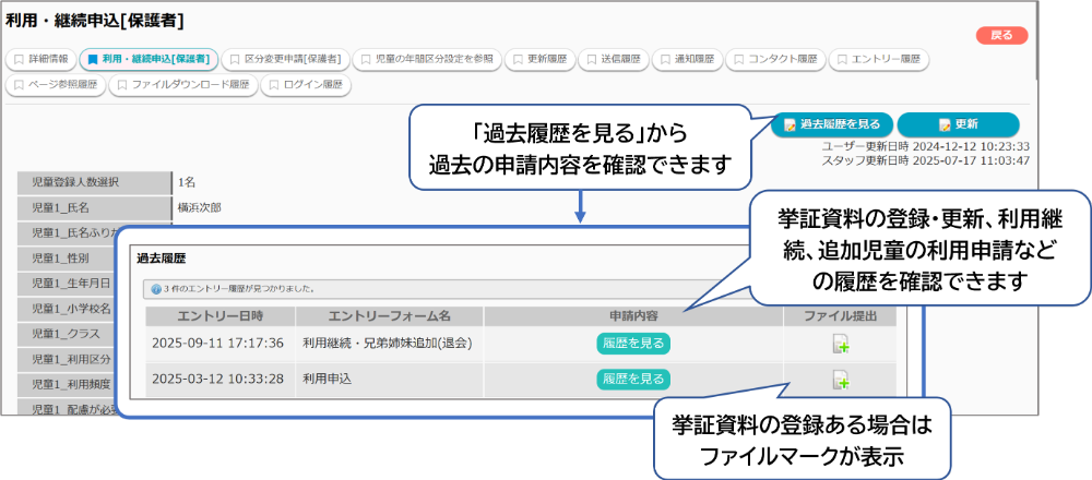 過去の申請内容・挙証資料は「過去履歴を見る」から確認できます。