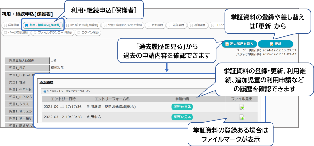 「入会・入所申込」、「利用継続・追加児童の利用申込」、「利用区分の変更申請(キッズクラブ)」するときに、挙証資料も提出します