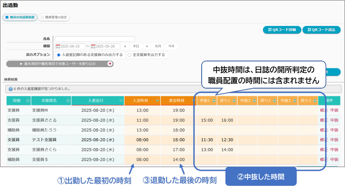 中抜している職員がいる時間帯に、職員配置が予定通りにそろっているかご確認ください。