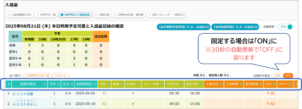 ※「利用予定一覧」画面を印刷してご利用している場合は、OFFにすると全児童を印刷できます。
