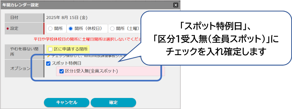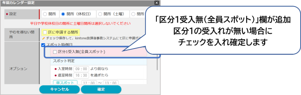 2)「スポット特例日」、「区分1受入無(全員スポット)」にチェックを入れ確定します。
