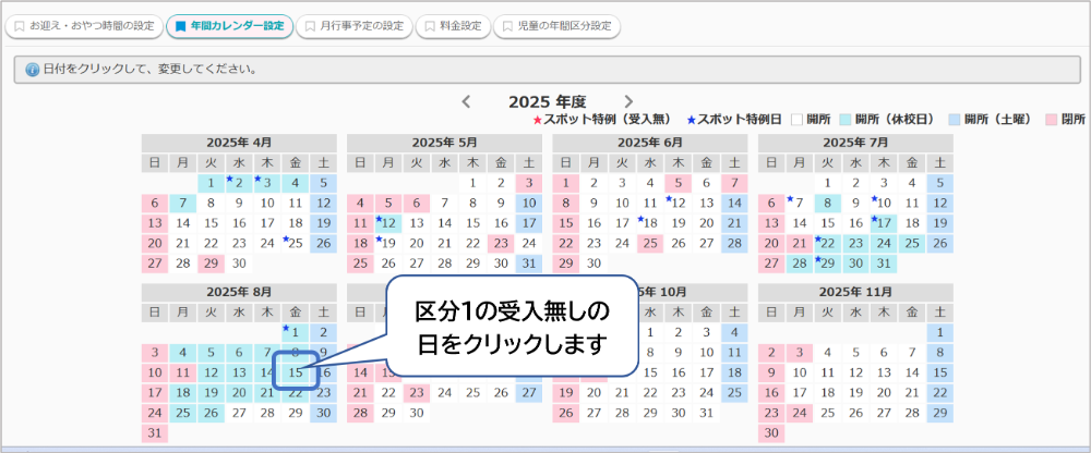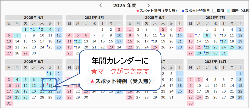 年間カレンダー設定で、わくわく【区分1】児童の受入無し日を簡単にチェックできるようになりました