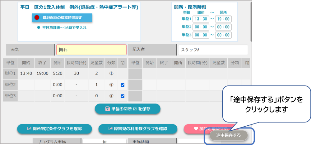 日誌の作成に時間がかかる場合に、随時「途中保存」を行ってください。