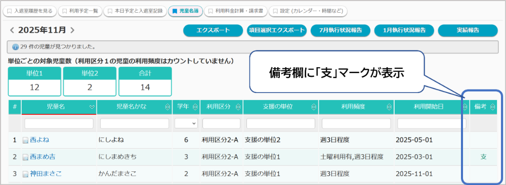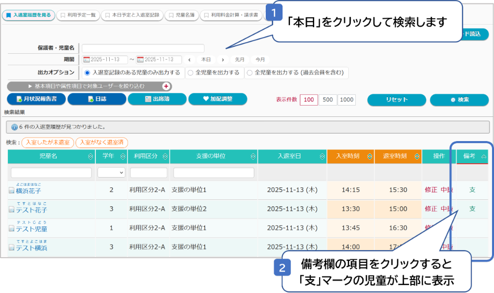 2)備考欄の項目をクリックすると、「支」マークの児童が上部に表示されます。