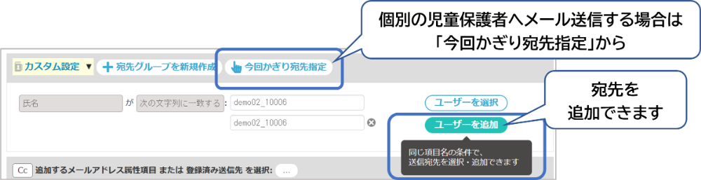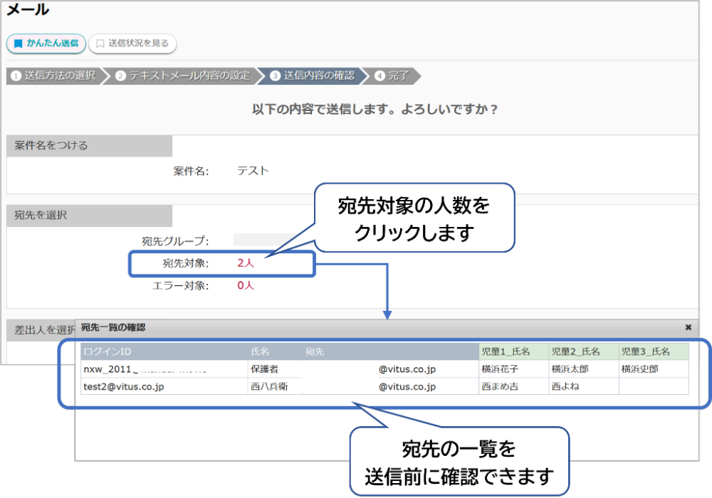 ■メール送信でおすすめ機能 ・送信前に誰に送るか宛先を確認したい 送信内容の確認画面で、宛先の一覧を確認できます。 ●送信内容の確認画面 「宛先対象」の数字をクリックすると、送信先の一覧を確認できます。 ぜひご活用ください。
