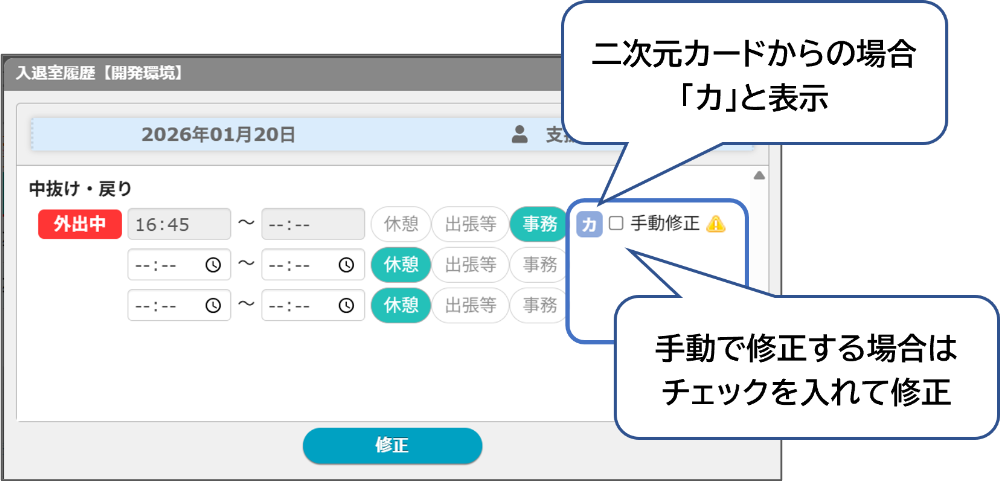 ■中抜時間の記録方法を確認できます ・二次元カードで読み取り記録した場合は「カ」と表示 ・管理画面から手動で入力した場合は「手」と表示 中抜けの入力・修正画面で確認できます。 ●二次元カードで読み取り記録した場合 「手動修正」をチェックをすると中抜時間を修正できます。 ●管理画面から手動で入力した場合