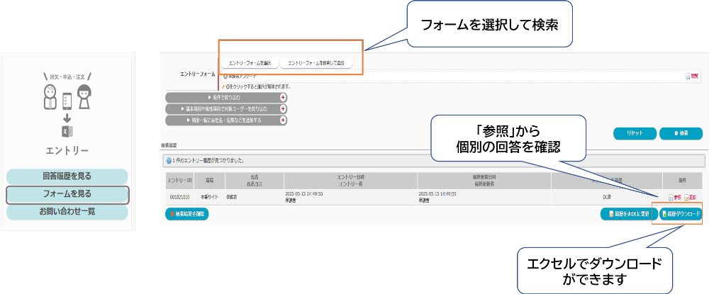 管理画面のエントリー「回答履歴を見る」から、フォーム毎の回答結果、イベント参加者を確認できます。