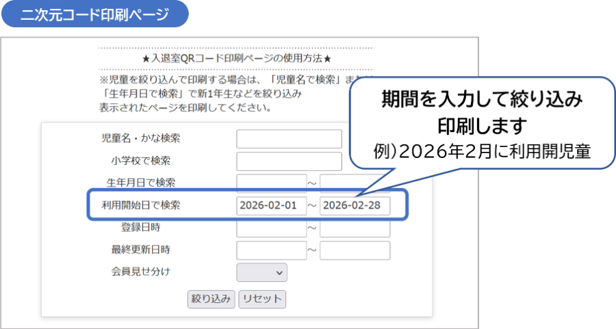 児童の「利用開始日」で絞り込んで、二次元コードを印刷できます。