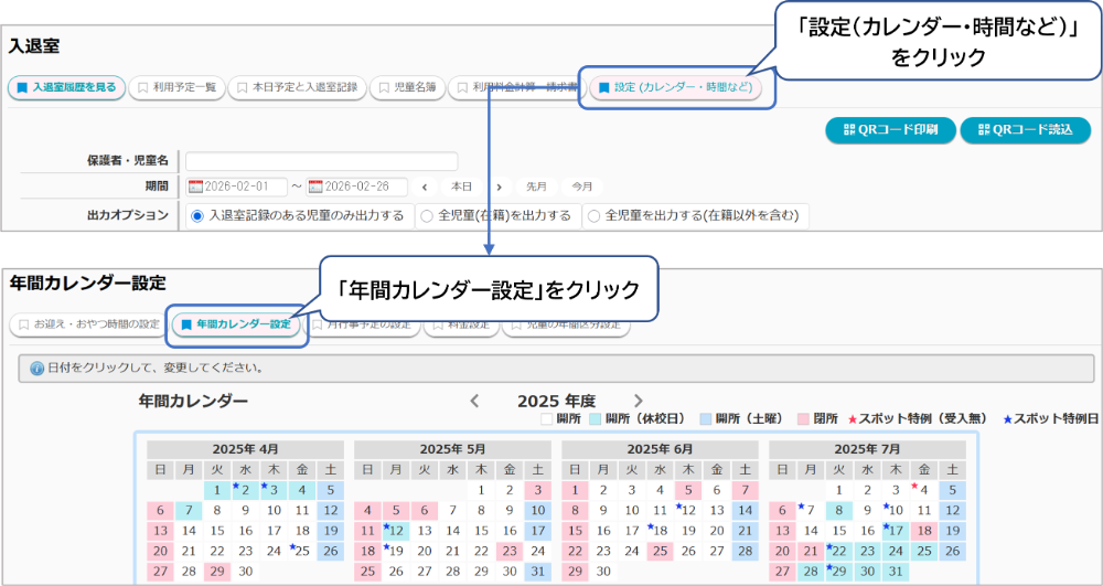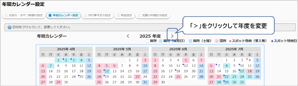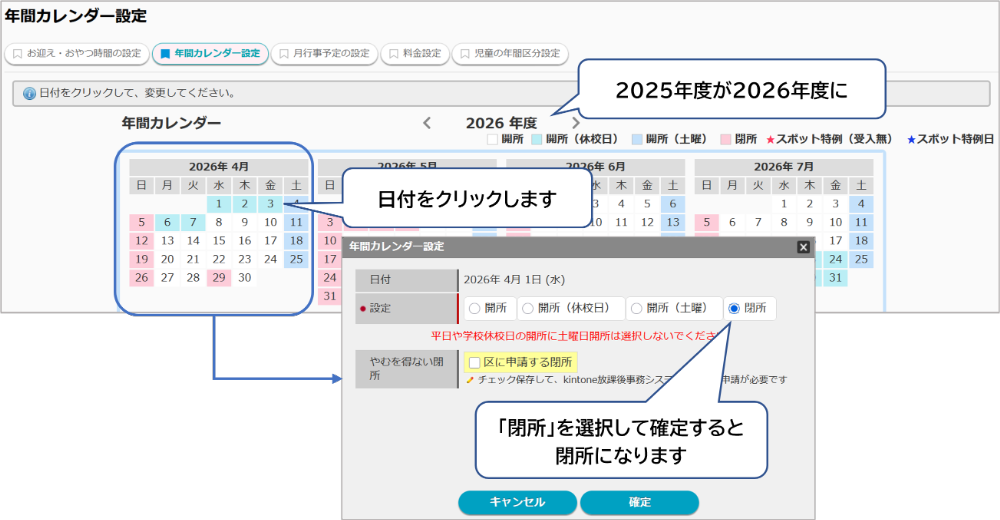 年間カレンダー設定で4月を閉所で設定すると、4月の利用申請の受付を閉じることができます。(保護者はこれまでの運営法人の専用サイトから4月の利用申請ができなくなります)