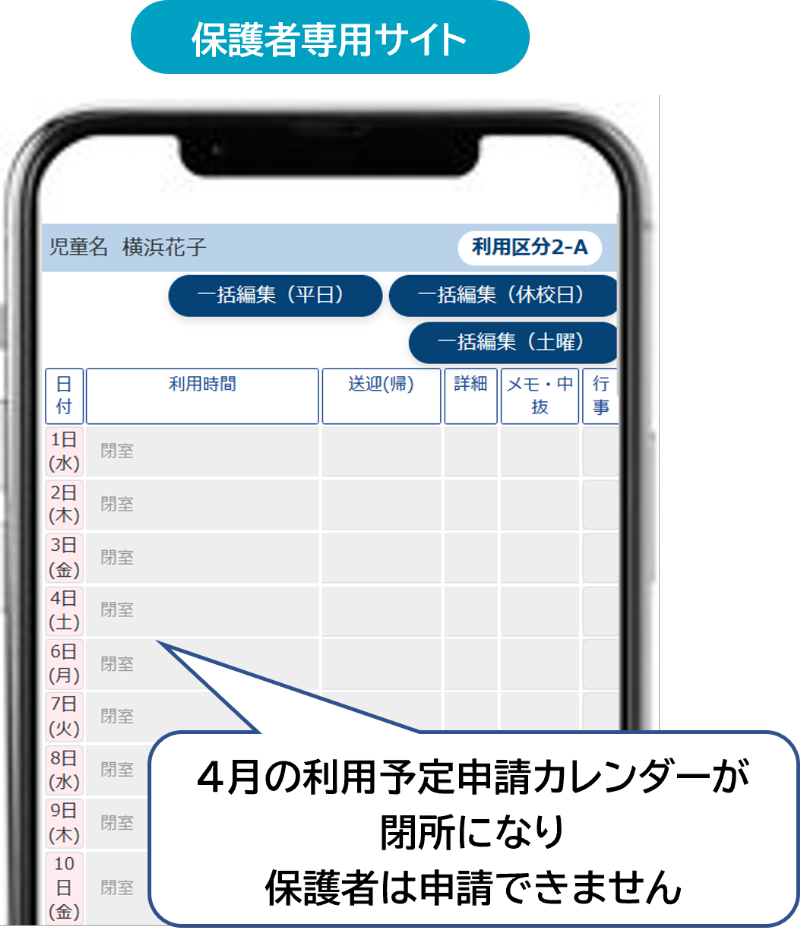 4月を閉所設定すると、保護者は4月の利用予定の申請ができなくなります。