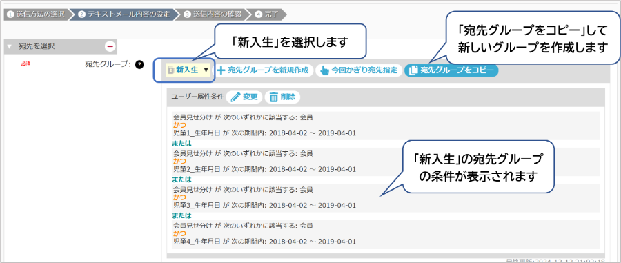 2)宛先グループで「新入生」を選択し、「宛先グループをコピー」をクリックします。