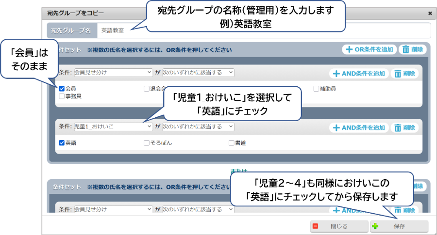 同様に児童2~4の条件に「おけいこ」を設定し保存すると、「英語教室」の宛先グループが作成されます。
