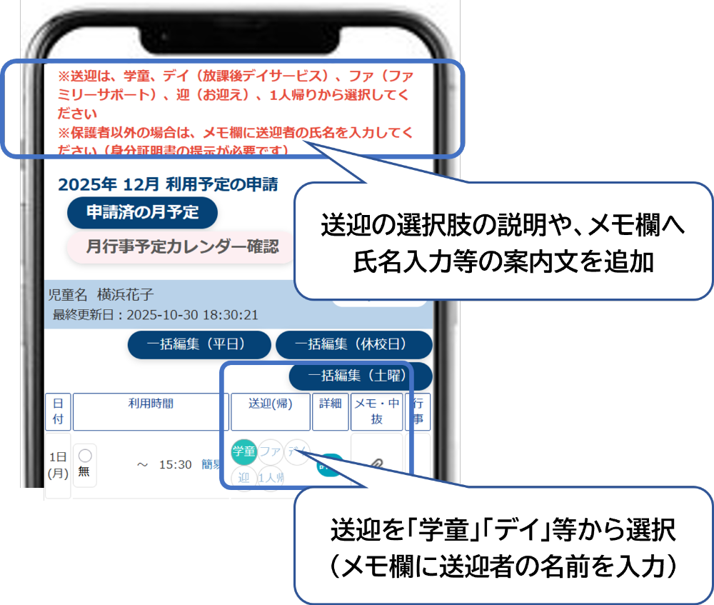 児童の利用予定登録画面にお迎えの選択ボタンの追加が可能です。