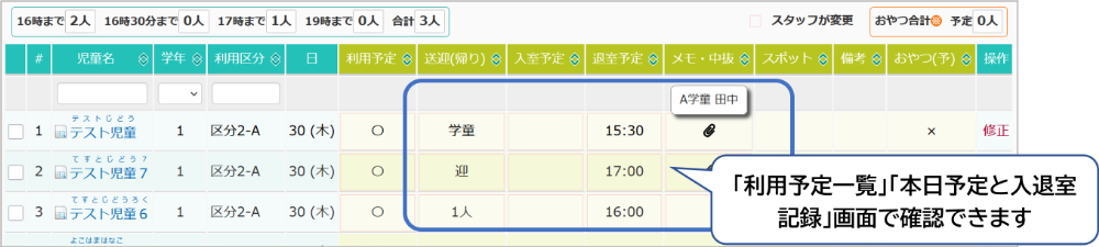 クラブでは「利用予定一覧」「本日予定と入退室履歴」画面で、送迎や代理引取人を確認できます。