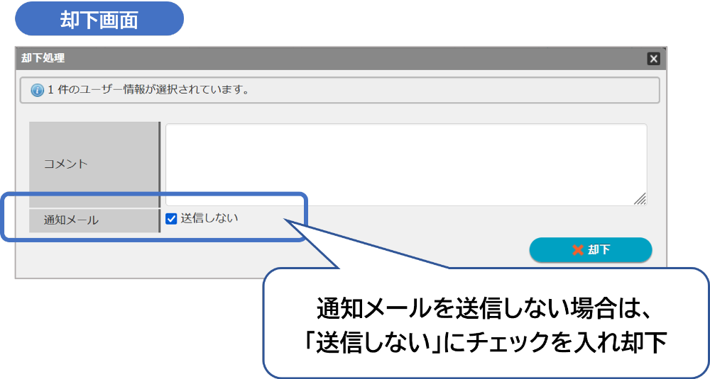 3)通知メールの「送信しない」にチェックを入れて、却下ボタンをクリックします。