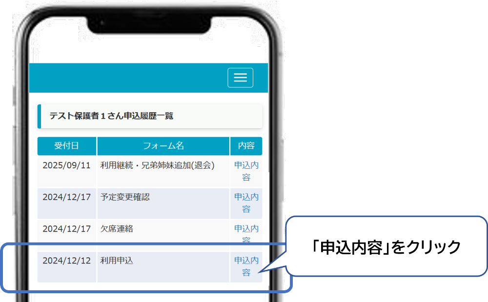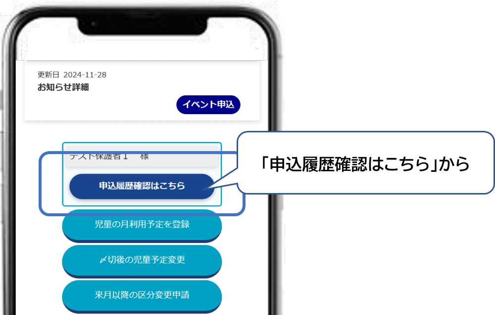 「申請履歴確認」から、利用申込・区分変更・利用継続などの申請や、イベントなどの参加申込をした履歴・内容を確認できます。