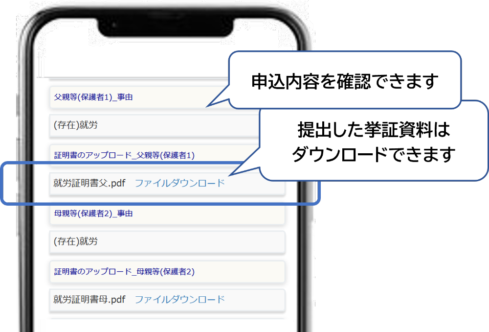 就労証明書や傷害保険払込受領証などを提出した書類の確認・ダウンロードもできます。