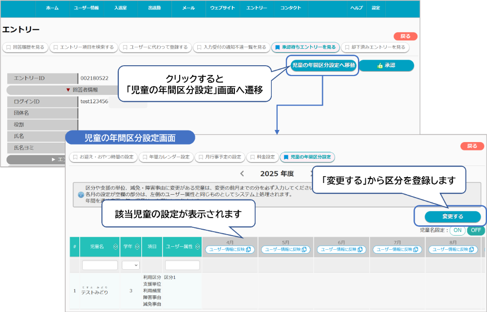 クラブでは、区分変更申請を確認、児童の年間区分設定で変更前月までの区分を登録し
