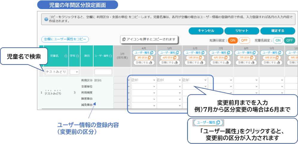 3)参照画面の「児童の年間区分設定へ移動」ボタンをクリックすると、児童の区分設定画面が表示されます。
