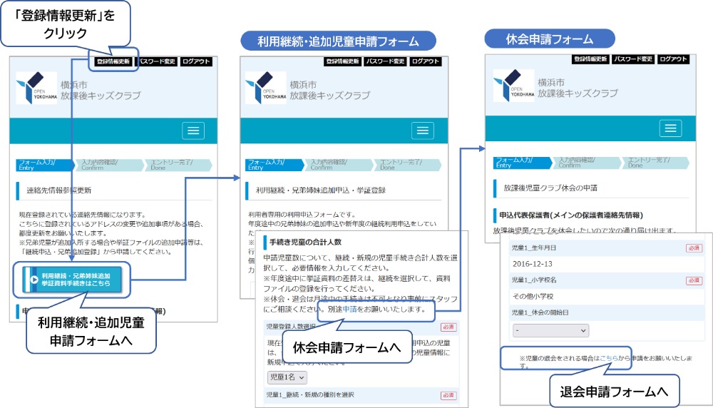 登録情報更新ページから利用継続フォーム、休会申請フォームへ遷移し、休会申請フォームのページ下から退会申請フォームを開き、申請することができます。