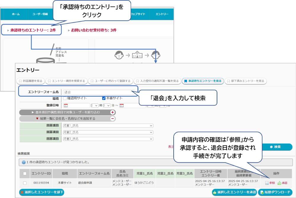 保護者から退会申請があると、管理画面ホームの「承認待ちのエントリー」が表示されます。