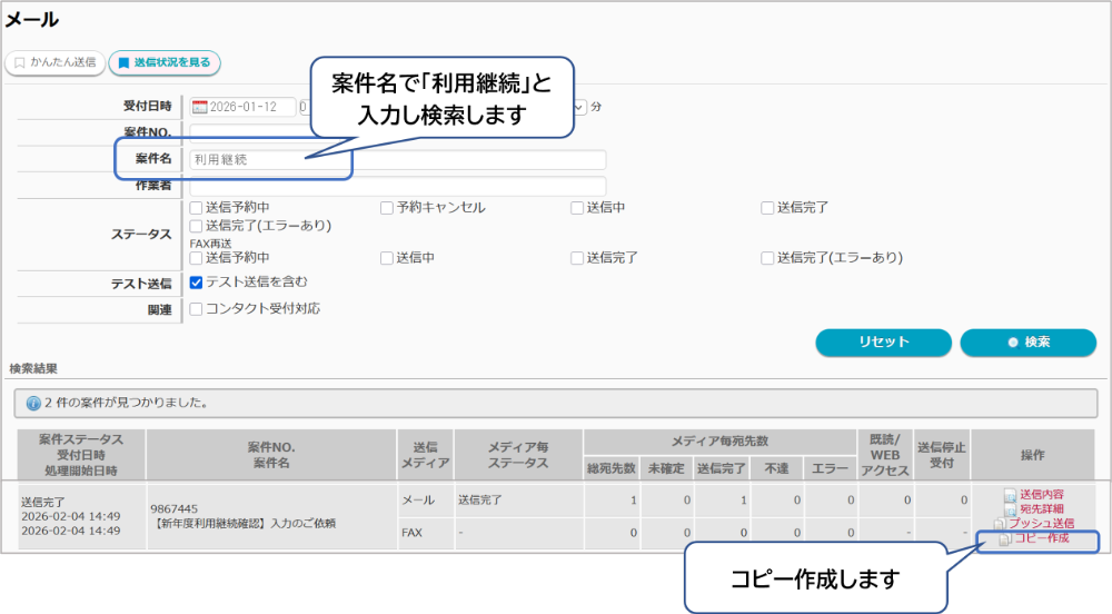 ユーザー情報から送信した利用継続申込のリマインドメールをコピー作成すると、宛先を個別に指定して送信できます。