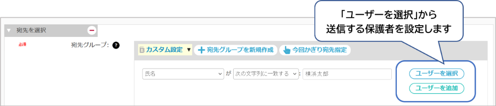 宛先グループで、「ユーザーを選択」から、児童名で検索して、氏名欄(赤字)をクリックすると宛先が設定されます。