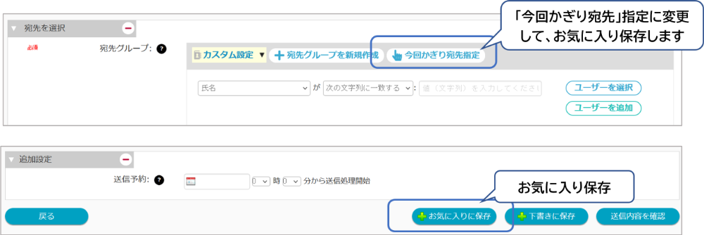 宛先グループを「今回かぎり宛先指定」にしてお気に入り保存します。