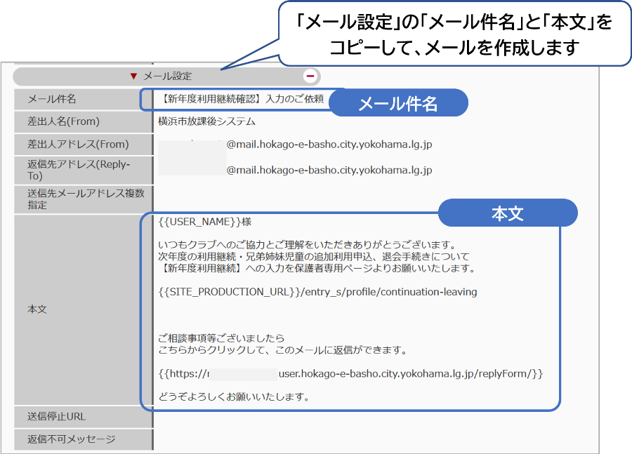 利用継続申込のリマインドメールの「メール件名」と「本文」をコピーして、