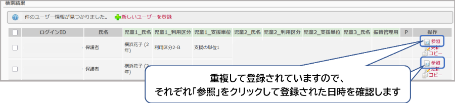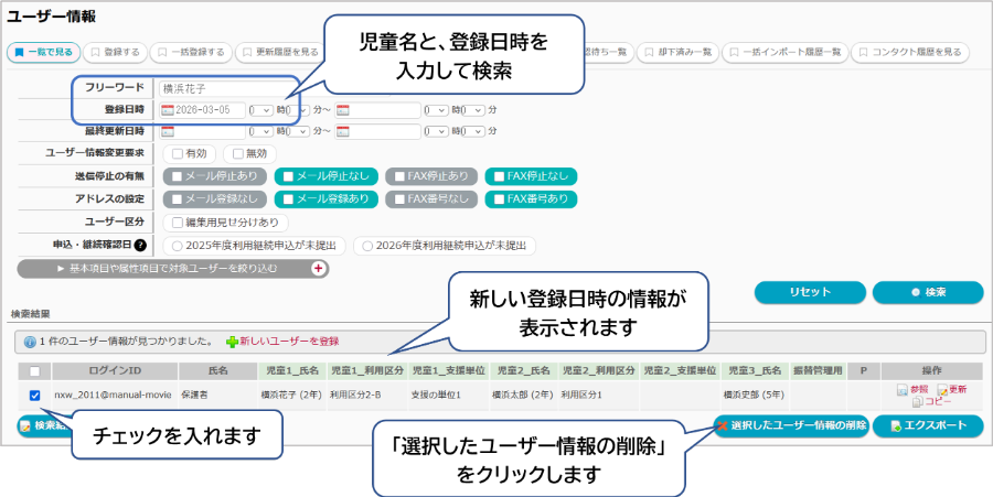 検索結果に新しい登録日時の情報が表示されたことを確認し、左の□にチェックを入れ、「選択したユーザー情報の削除」をクリックすると登録情報が削除されます。