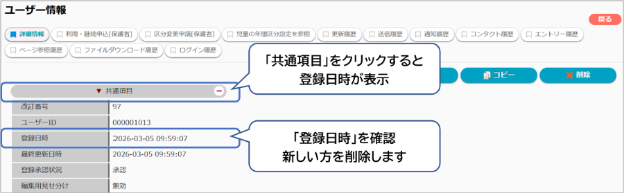 (1)ユーザー情報から登録日時が新しい児童情報(利用実績がない方)を削除して