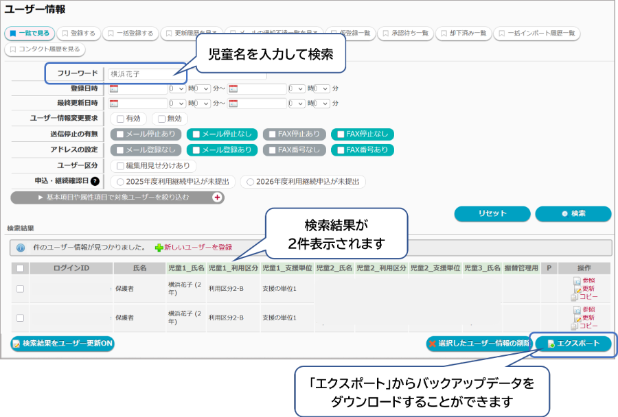 フリーワードに児童名を入力、登録日時に新しい方の登録日をカレンダーから選択して検索します。
