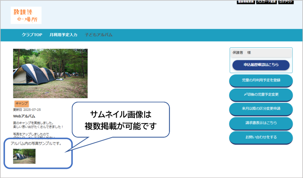 子どもアルバムのメニューを追加したい場合は、サポートセンター(support-houkago@vitus.co.jp)までご連絡ください。