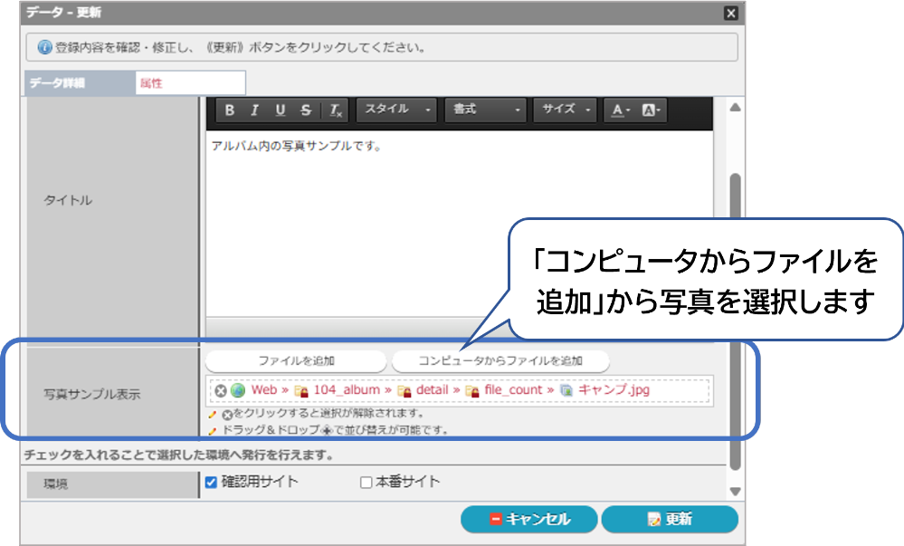 3)編集画面の「写真サンプル表示」の「コンピューターからファイルを追加」から写真を選択(複数選択可)して、更新します。