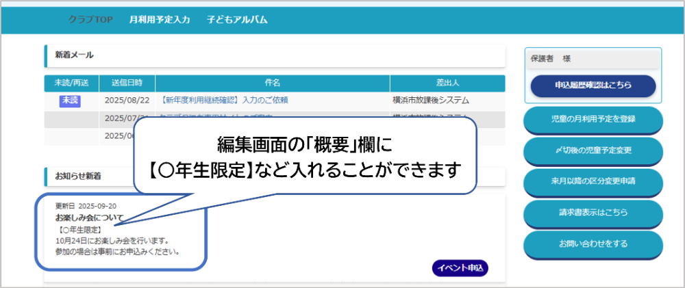 クラブTOP「お知らせ」で案内をするときに【○年生限定】と記載します