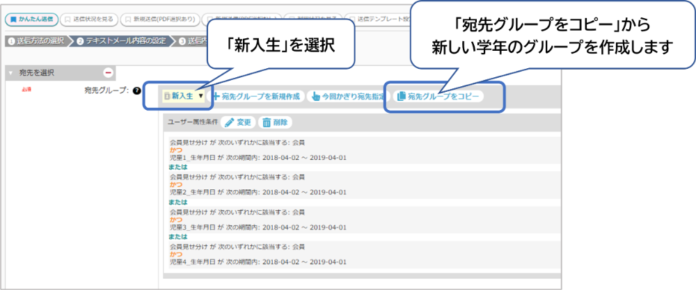 宛先グループで、「新入生」を選択して、「宛先グループをコピー」から