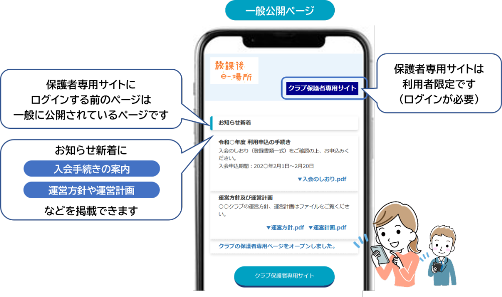 放課後e-場所システムでは、クラブを利用している児童保護者限定の「保護者専用サイト」と、利用者以外の方も閲覧できる「一般公開ページ」を利用できます。