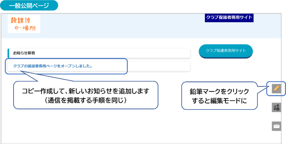保護者専用サイトにはログインせず、表示されたページの右の鉛筆ボタンをクリックすると編集モードに切り替わります。